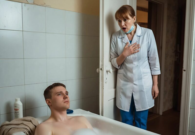 She entered the room, looked at him, and with difficulty helped the orderly carry him to the bathroom. She filled the tub, checked the temperature, added some foam, and began gently washing him. Everything was quiet — only the sound of water and her soft sighs could be heard.