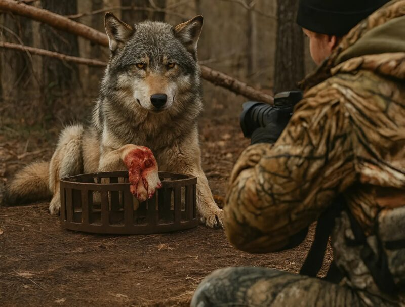 He took a slow step forward, careful not to look the wolf directly in the eyes so as not to seem threatening. The wolf didn’t growl — it just breathed quietly, watching his every movement. The man crouched down, carefully opened the trap, freed the wolf’s paw, and stepped back a few paces.