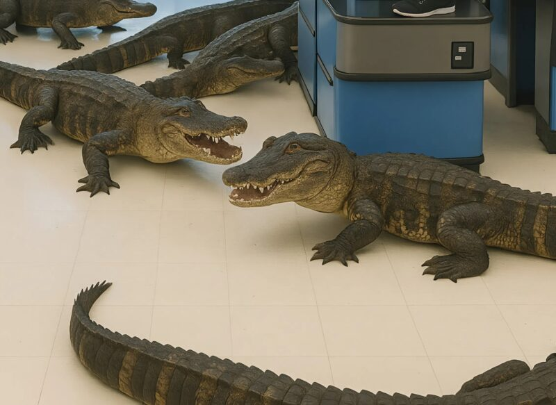 In the next moment, dozens — maybe even more — alligators entered the store. People ran frantically in all directions, trying to escape the predators. Some, who were closer to the exit, managed to get out, while others climbed onto tables and shelves.
